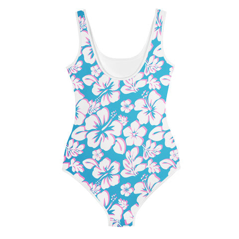 Aqua Blue, Pink and White Hawaiian Flowers Girls One-Piece Swimsuit – Eco Swimwear by Extremely Stoked®