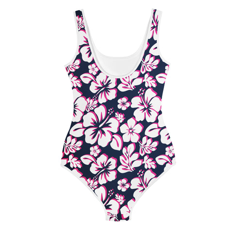Navy Blue, Hot Pink and White Hawaiian Flowers Girls One-Piece Swimsuit – Eco Swimwear by Extremely Stoked®