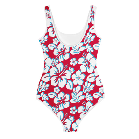 Red, Aqua Blue and White Hawaiian Flowers Girls One-Piece Swimsuit – Eco Swimwear by Extremely Stoked®