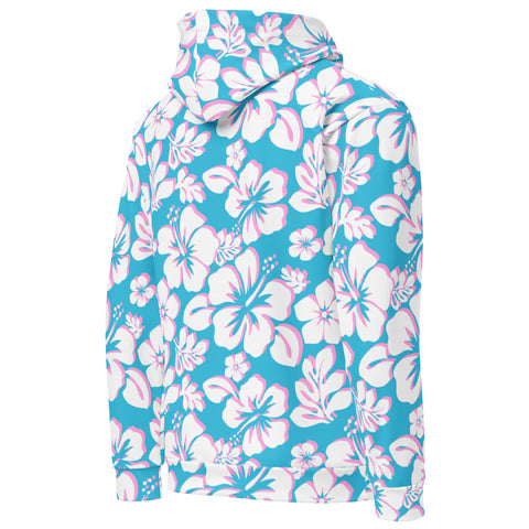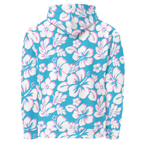 Aqua Blue, Pink and White Hawaiian Flowers Premium Cotton Hoodie - Extremely Stoked®