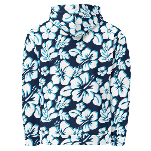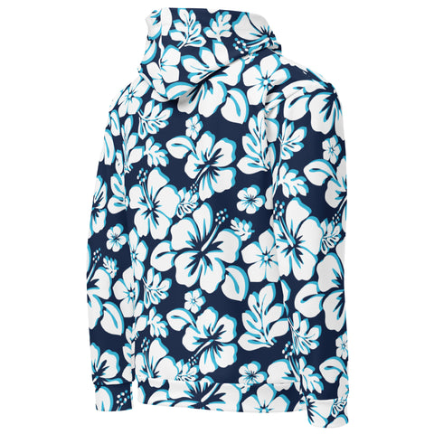 Navy Blue, Aqua Blue and White Hawaiian Flowers Premium Cotton Hoodie - Extremely Stoked®