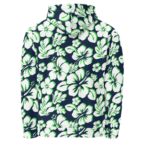 Navy Blue, Lime Green and White Hawaiian Flowers Premium Cotton Hoodie - Extremely Stoked®