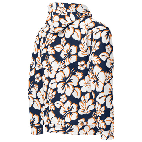 The Navy Blue, Orange and White Hawaiian Flowers Premium Cotton Hoodie delivers the laid-back joy of a Hawaiian shirt with the cozy comfort of a favorite hoodie — a standout piece designed for good feels, all day long.