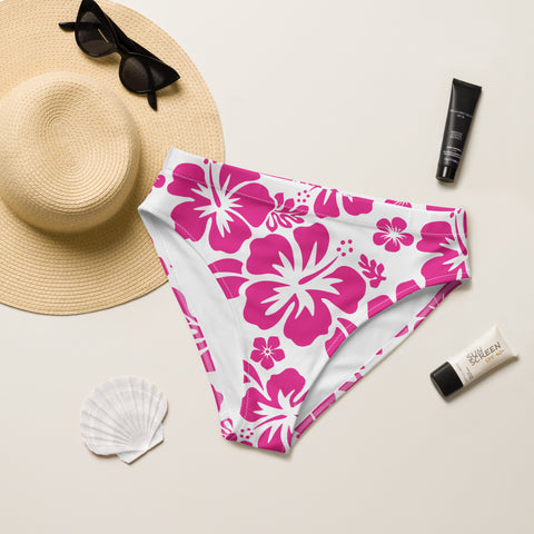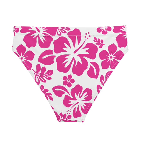 Hot Pink Hawaiian Flowers on White High Waisted Bikini Bottom – Eco Swimwear from Extremely Stoked®
