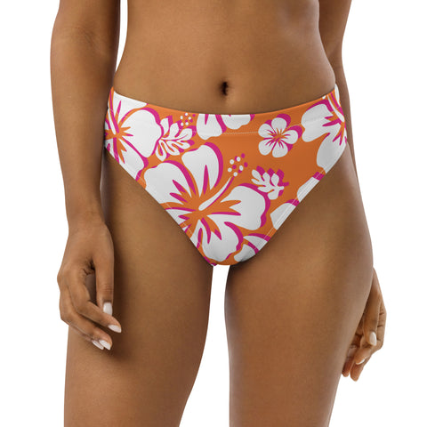 Juicy Orange, White and Hot Pink Hawaiian Flowers High Waisted Bikini Bottom – Eco Swimwear from Extremely Stoked®