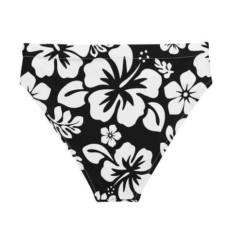 White Hawaiian Flowers on Black High Waisted Bikini Bottom – Eco Swimwear from Extremely Stoked®