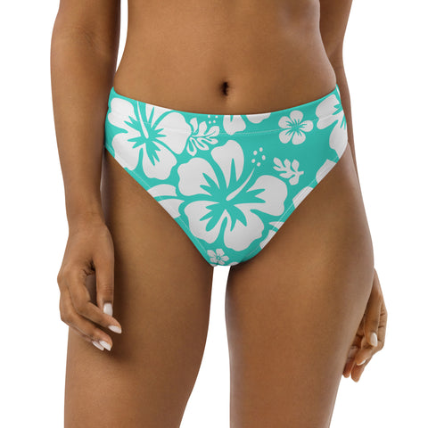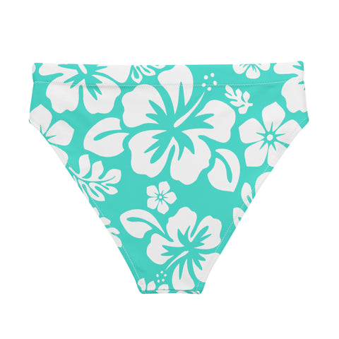 White Hawaiian Flowers On Turquoise High Waisted Bikini Bottom – Eco Swimwear from Extremely Stoked®