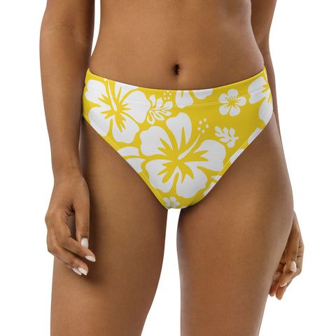 White Hawaiian Flowers on Yellow High Waisted Bikini Bottom – Eco Swimwear from Extremely Stoked®
