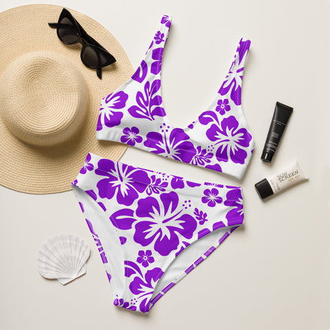 Purple Hawaiian Flowers on White High Waisted Bikini – Eco Swimwear by Extremely Stoked®