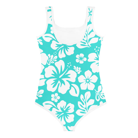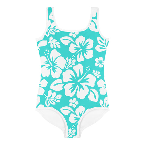 Turquoise and White Hawaiian Flowers Little Girls One-Piece Swimsuit – Eco Swimwear by Extremely Stoked®