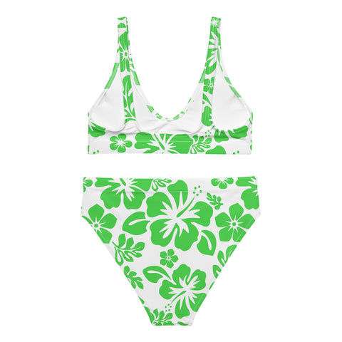 Lime Green Hawaiian Flowers on White High Waisted Bikini – Eco Swimwear by Extremely Stoked®