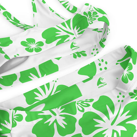 This bold and playful set features our signature Hawaiian Flowers print in a refreshing lime green, blooming against a vibrant White backdrop for that ultimate beach goddess vibe.